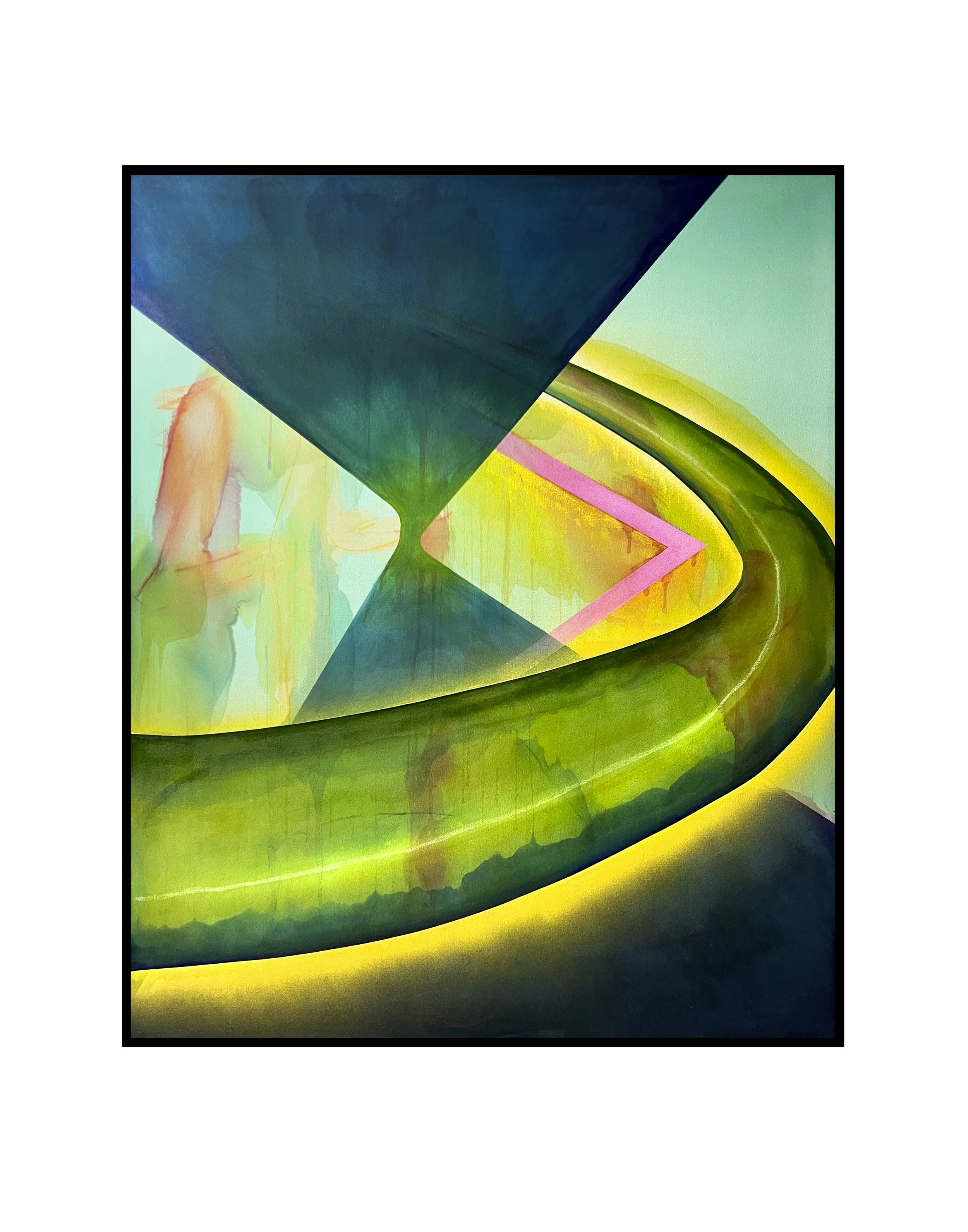This painting started as a challenge: what if my portraits were the most obscure, abstract versions of themselves? I began with a single fluid, transparent jewel-tone green—a color that felt like the atmosphere of another planet. Powdered, softened, and spread, it became the sky. Then came the figure: Adrian Jimenez, sketched lightly in pencil from a reference in my archives. But Adrian, as we know him, disappeared quickly, morphing into lines, curves, and blocks of color.